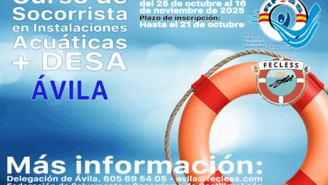 Fecha de inicio del curso: 25 de octubre de 2025 Plazo de inscripción: Hasta el 21 de octubre de 2025 Precio: 350 € Nº cuenta bancaria de la Federación: BANCO SANTANDER ES89 0049 0020 5521 1199 8973 Más información en la Delegación de Salvamento y Socorrismo de Ávila. Teléfono: 605 69 54 05avila@fecless.com y escuela@fecless.com