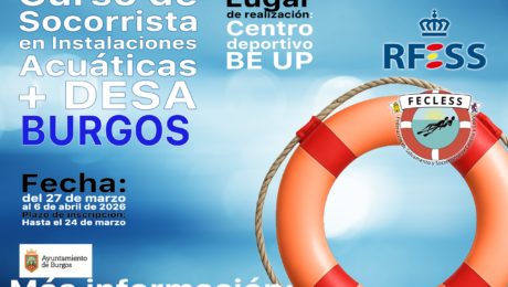La Federación de Salvamento y Socorrismo de Castilla y León organiza un curso de Socorrista en Instalaciones Acuáticas y manejo de DESA en Burgos Fechas en la que se desarrolla el curso: del 27 de marzo al 6 de abril de 2026 Fecha tope de inscripción: 24 de marzo Precio: 350 € Nº cuenta bancaria