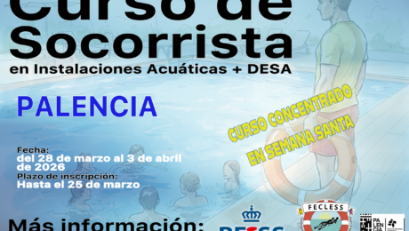 La delegación de Salvamento y Socorrismo de Palencia organiza curso intensivo de Socorrista en Instalaciones Acuáticas + DESA Fecha de inicio del curso: del 28 de marzo al 3 de abril de 2026 Plazo de inscripción: Hasta el 25 de marzo Precio: 350 €Nº cuenta bancaria de la Federación: BANCO SANTANDER ES89 0049 0020 5521
